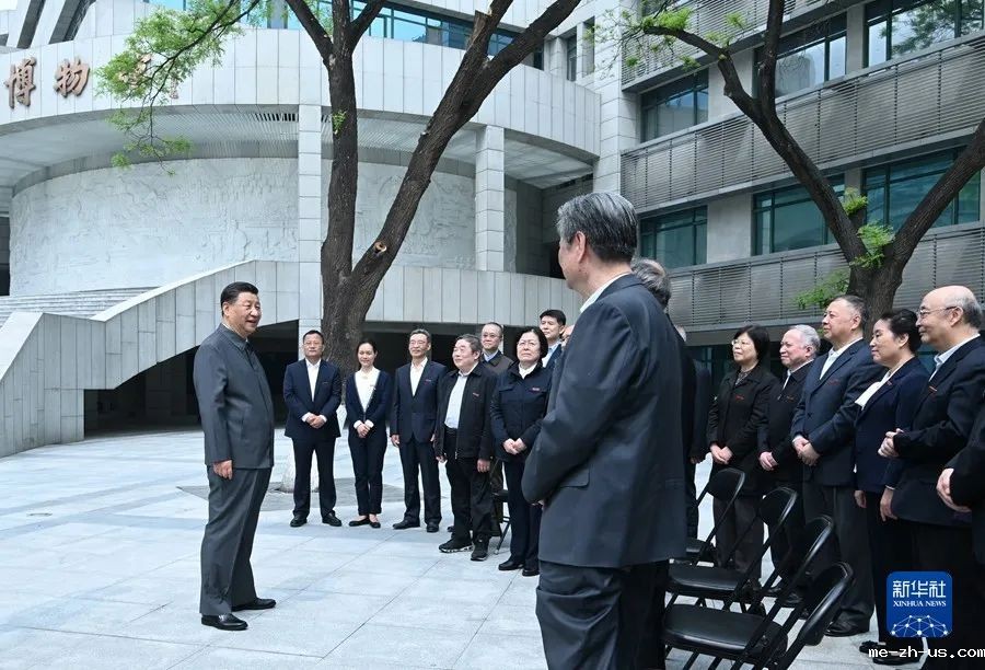 4月25日上午,中共中央总书记、国家主席、中央军委主席习近平来到中国人民大学考察调研。这是习近平在博物馆门前广场上,同老教授、老专家和中青年骨干教师代表亲切交谈。新华社记者 谢环驰 摄