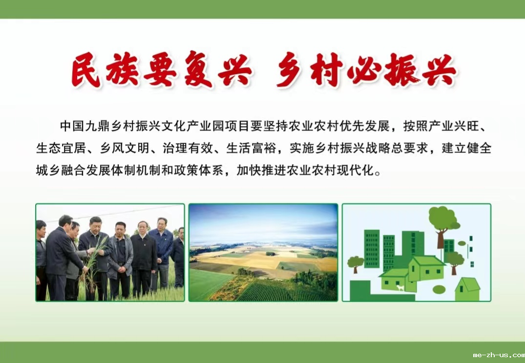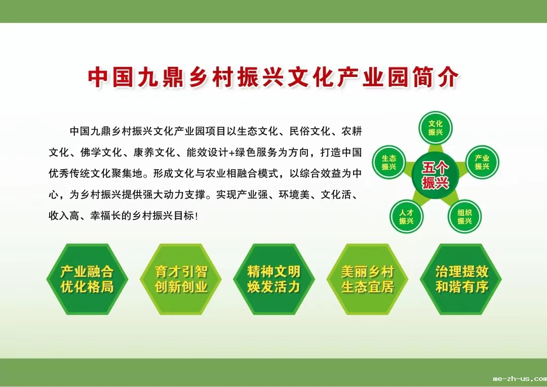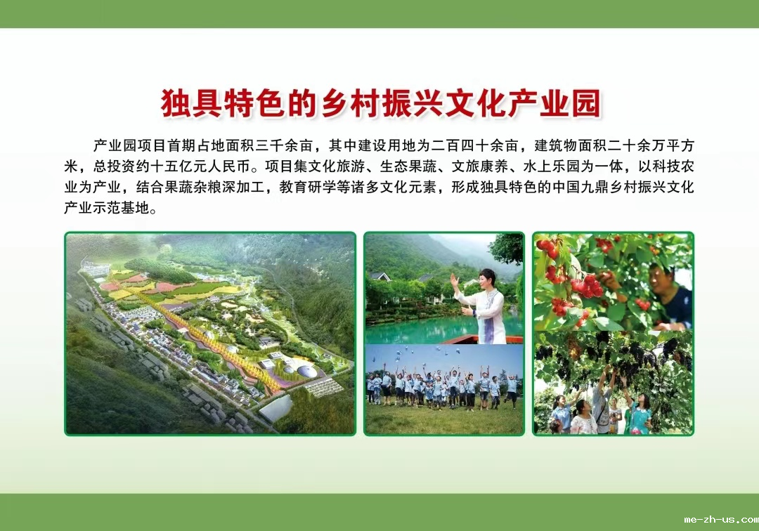 产业赋能,乡村振兴,需要党建引领,需要文化铸魂,需要真抓实干。中国九鼎乡村振兴文化产业园项目以生态文化、民俗文化、农耕文化、康养文化、能效设计+绿色服务为方向,打造中国优秀传统文化新高地。形成文化与农业融合模式,以综合效益为中心,为乡村振兴提供强大动力支撑。实现产业强、环境美、文化活、收入高、幸福长的乡村振兴目标!