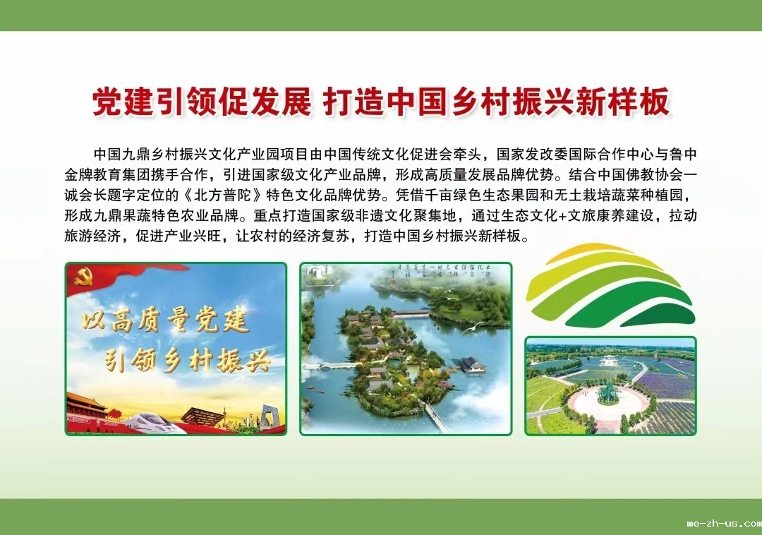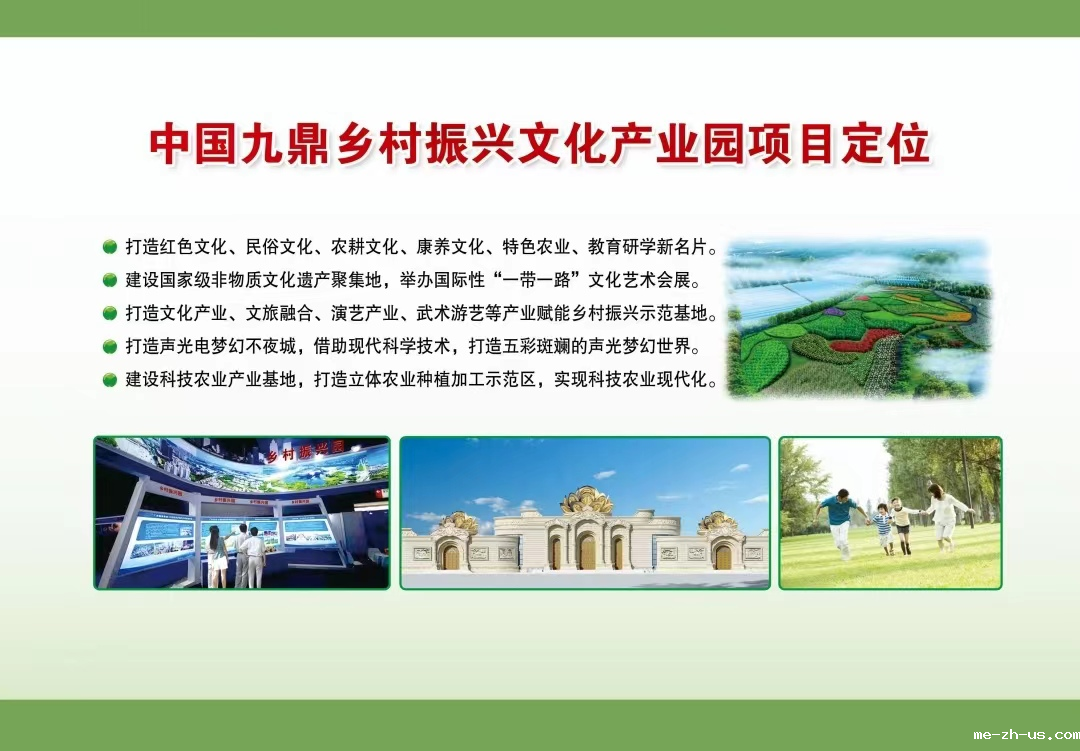 中国九鼎乡村振兴文化产业园项目是在淄博市2020年重大项目和山东省第一批新旧动能转换优选项目的基础上,以文化振兴为基础,植入诸多优秀文化元素,打造特色文化,推进文旅康养,形成产业优势,促进乡村文化振兴、生态振兴、产业振兴、组织振兴和人才振兴,实现产业强、环境美、文化活、收入高、幸福长的乡村振兴目标!