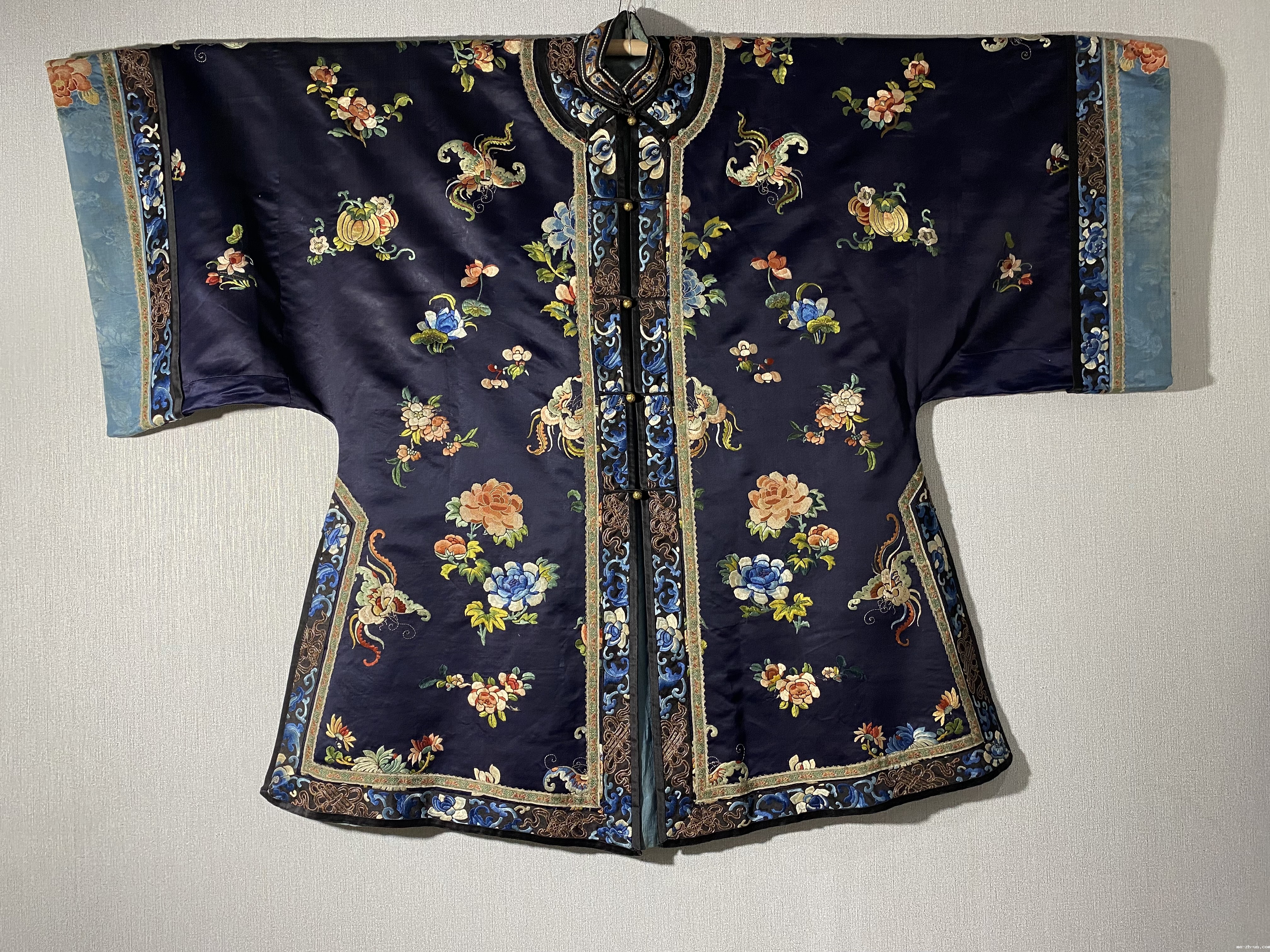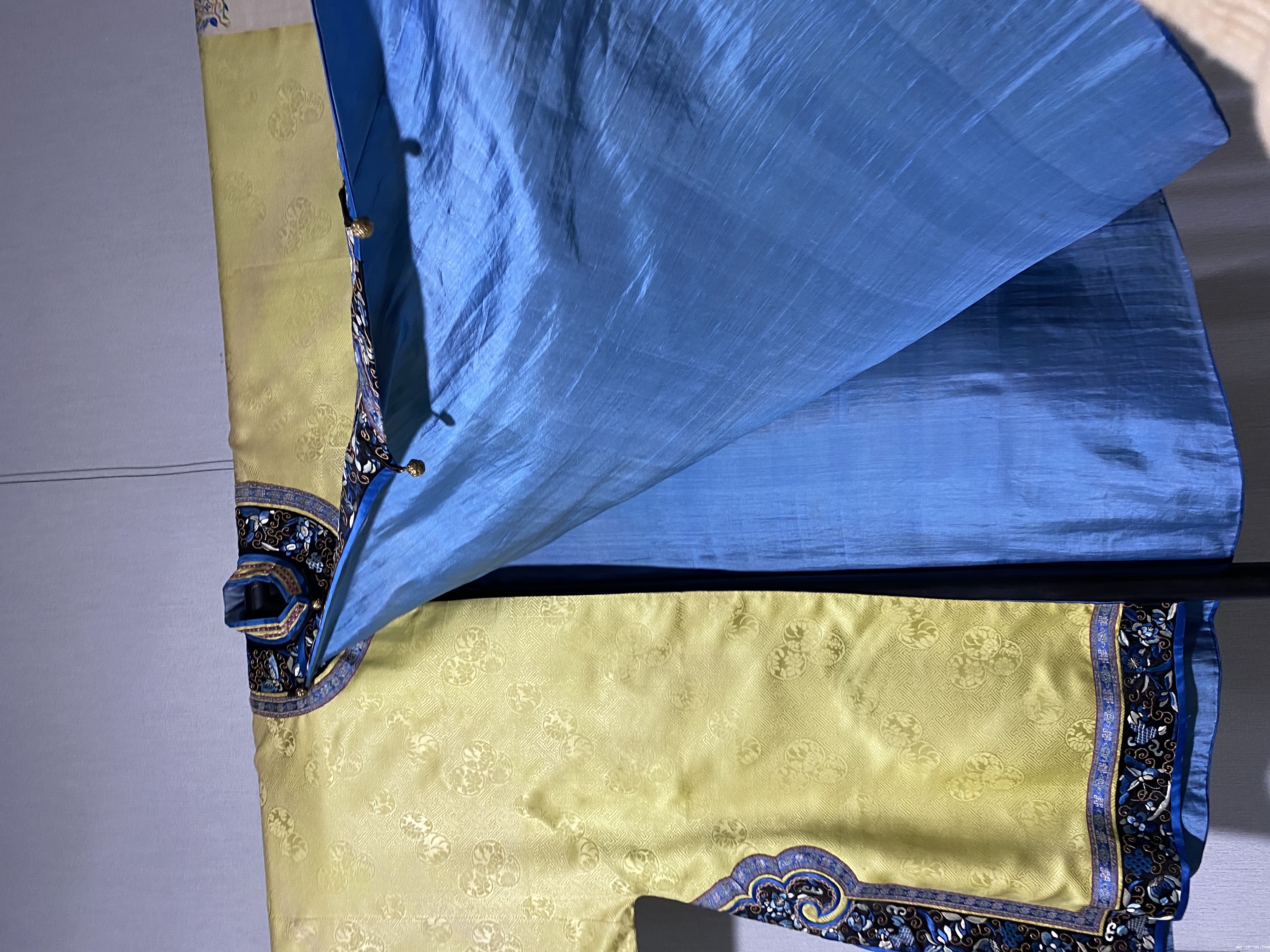 石青色五彩绣喜相逢对襟袍褂、明黄色真丝皮球花暗纹女褂